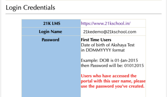 The password for first-time users is the date of birth of the learner in the DDMMYYYY format. These details are essential for the one-time setup process for activating your Gmail account, Zoom account, 21K School portal, and applications.