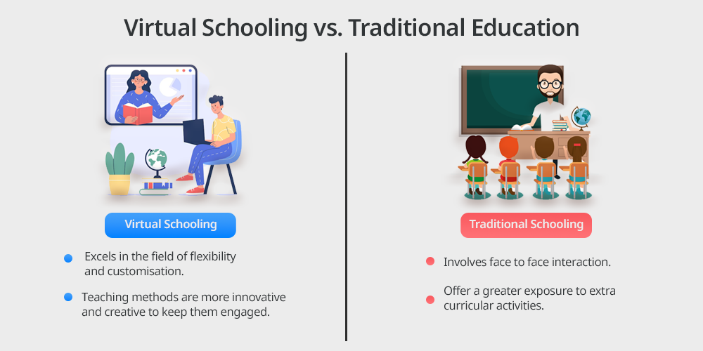 While traditional education is an existing form of structured environment which involves face to face interaction for students, virtual schooling excels in the field of flexibility and customisation for students.